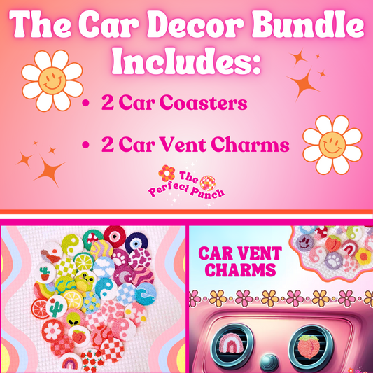Punch Needle Car Decor Bundle | 2 Car Coasters + 2 Car Vent Charms