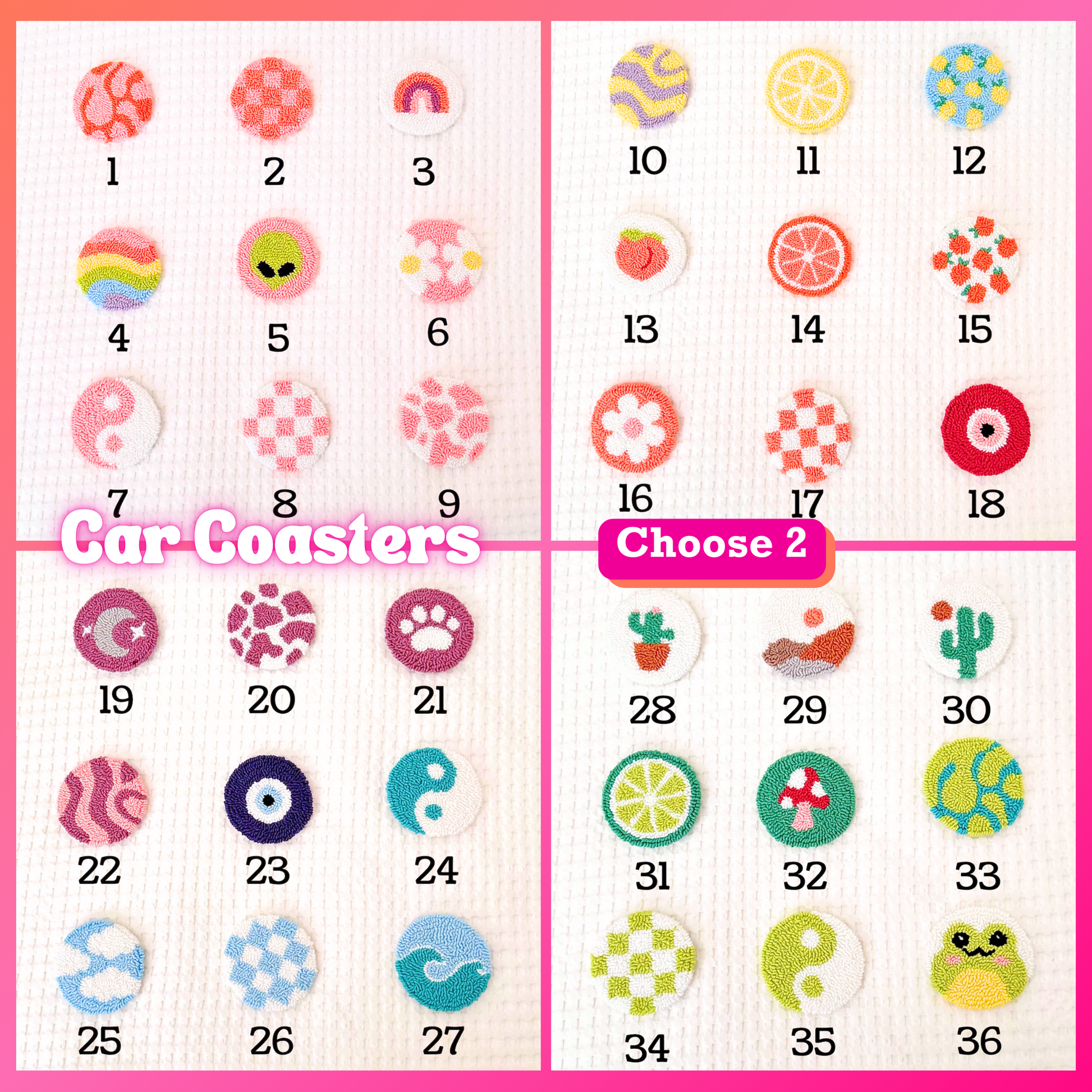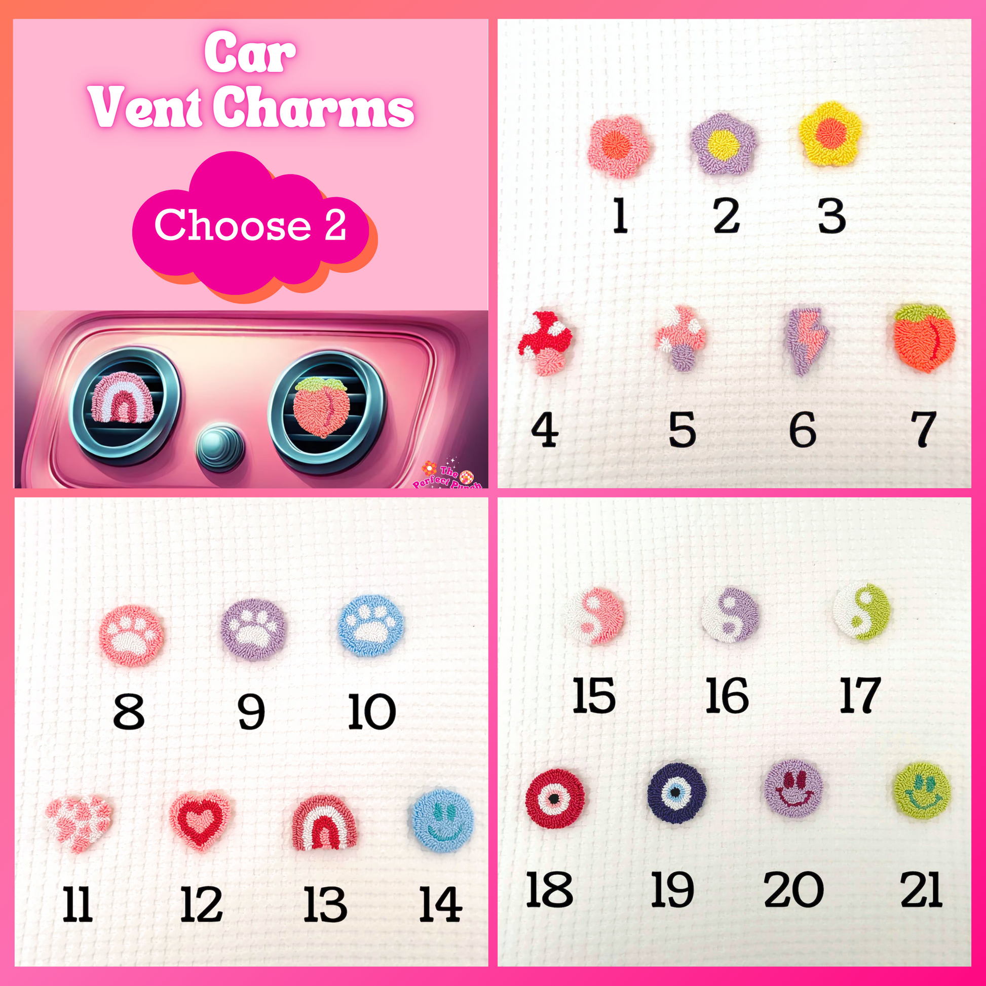 Elevate your car decor with our Punch Needle Car Decor Bundle! Handmade with high quality yarn and designed for you to mix and match! This bundle ($40 Value) includes 2 Car Coasters and 2 Car Vent Charms. Create your own unique style while keeping your car cute and protected ♡